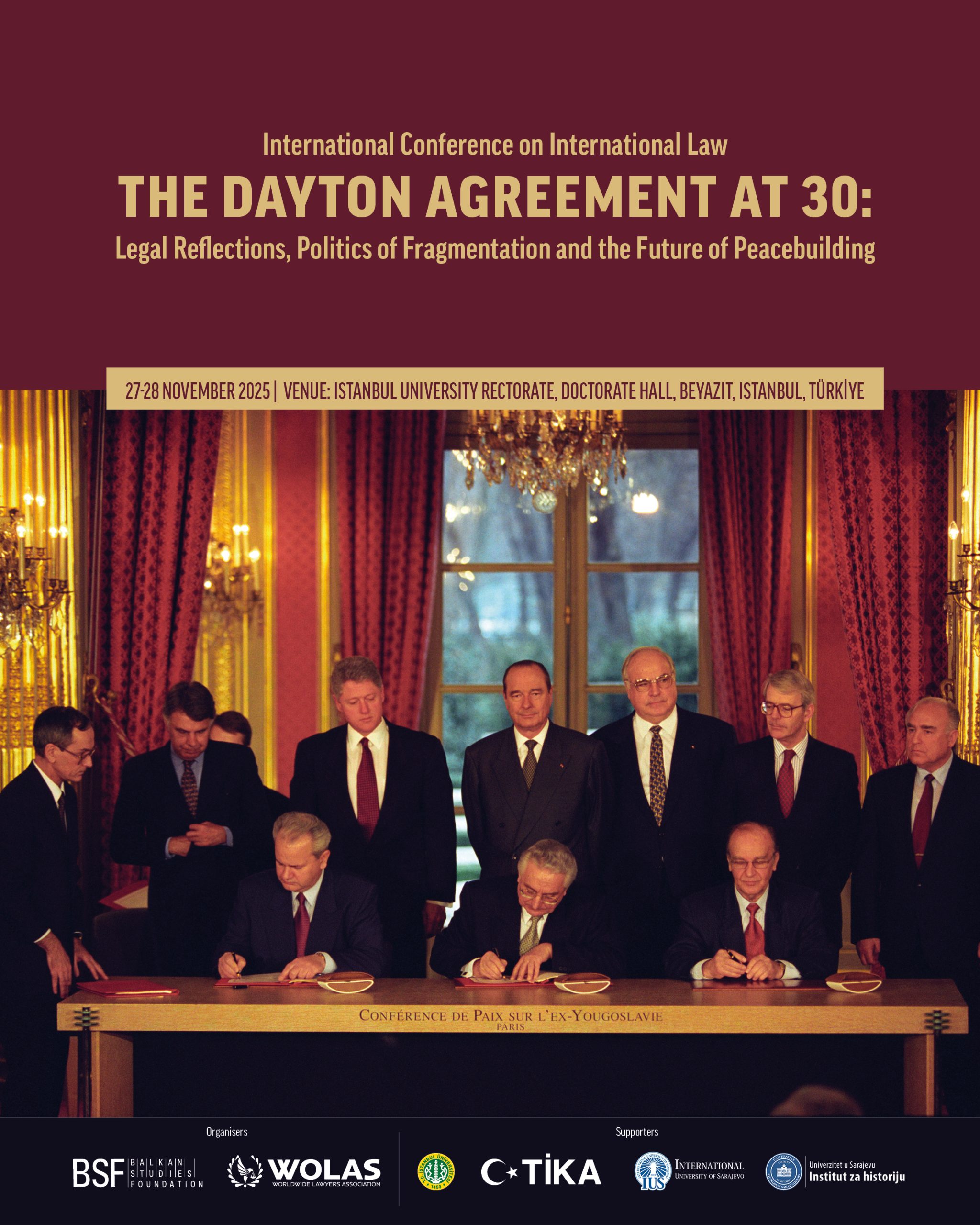 The International Conference on International Law: “The Dayton Agreement at 30: Legal Reflections, Politics of Fragmentation and the Future of Peacebuilding” will take place on 27–28 November 2025 at Istanbul University, Doctorate Hall.